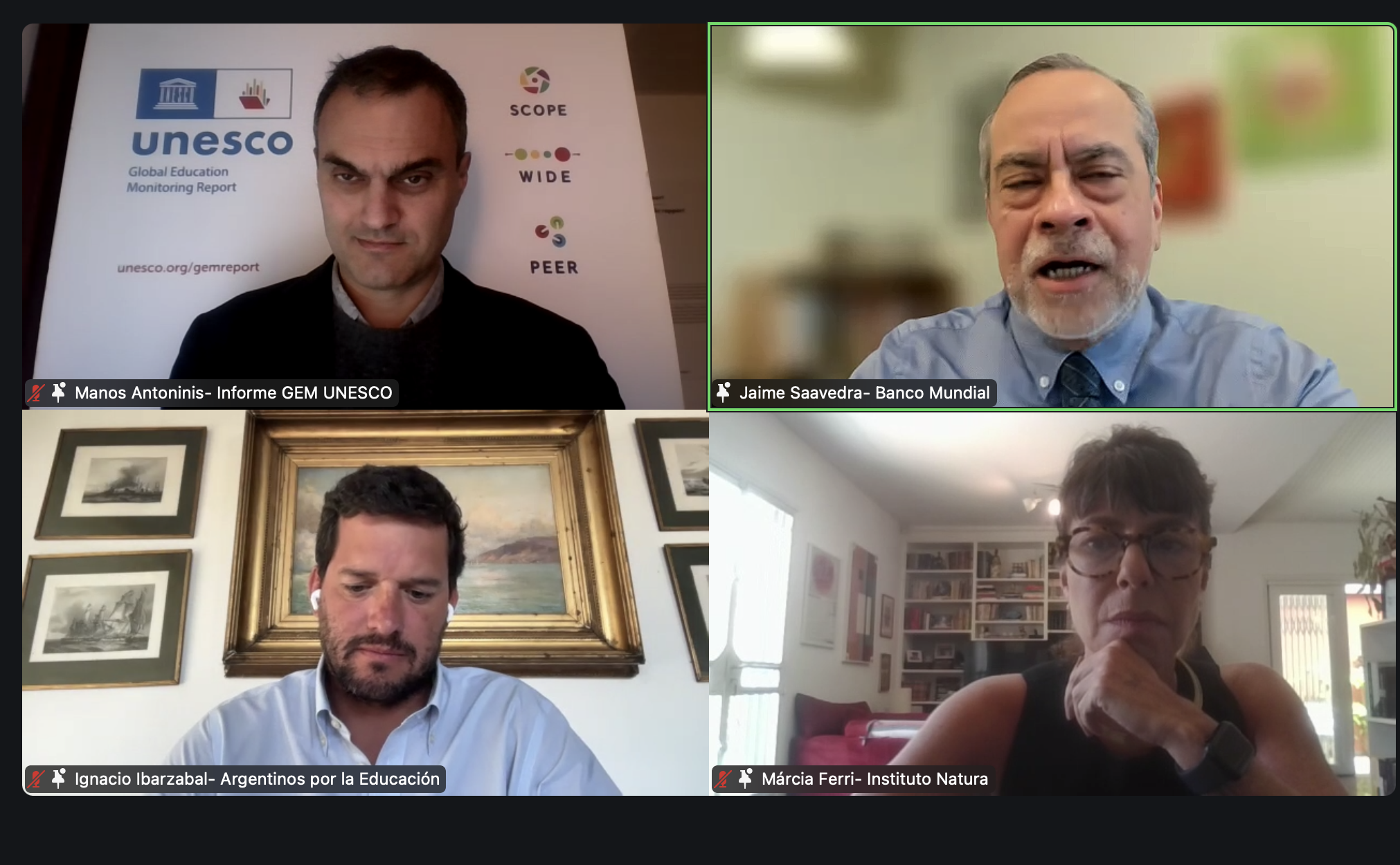 El director ejecutivo de Argentinos por la Educación, Ignacio Ibarzábal, participó como panelista en el Foro regional de alto nivel “De vuelta a clases: liderar para transformar”, un encuentro organizado por el Informe GEM de la UNESCO, Global School Leaders y la Organización de Estados Iberoamericanos (OEI), que se realizó de manera virtual.